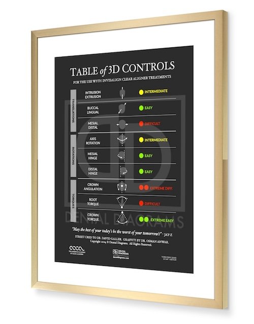 The AACA Table of 3D Controls poster with the powerful concepts from Reingage 1 and the American Academy of Clear Aligners (AACA) by Dr. David Galler. This unique print was designed and generated by Dr. Osman Anwar. In addition to helping providers retain the important concepts during the treatment planning of tooth movements, this serves as a unique art piece for a clinic or professional officeÂ