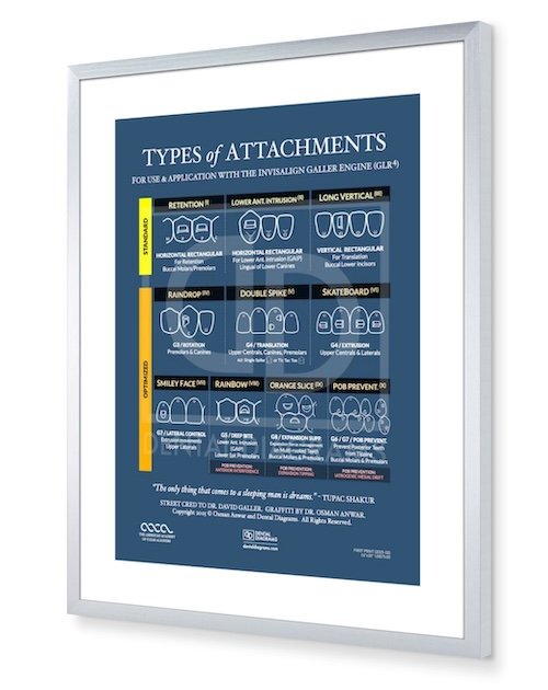The AACA Types of Attachments poster with the powerful concepts from Reingage 1 and the American Academy of Clear Aligners (AACA) by Dr. David Galler. This unique print was designed and generated by Dr. Osman Anwar. In addition to helping providers retain the important concepts during the prevetion and treatment of Posterior Open Bite during orthodontic tooth movements, this serves as a unique art piece for a clinic or office.